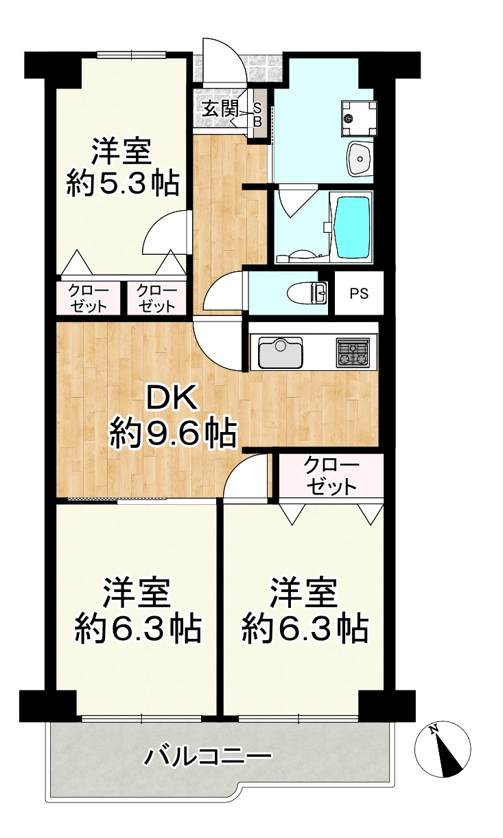 3LDK+南向きバルコニーがあるお部屋です。全居室が約6帖以上あり、収納スペースもございます。LDKは約18.9帖あり、LDを見渡せられるカウンターキッチン付きです。令和8年1月室内リフォーム完成予定です。(備考参照)