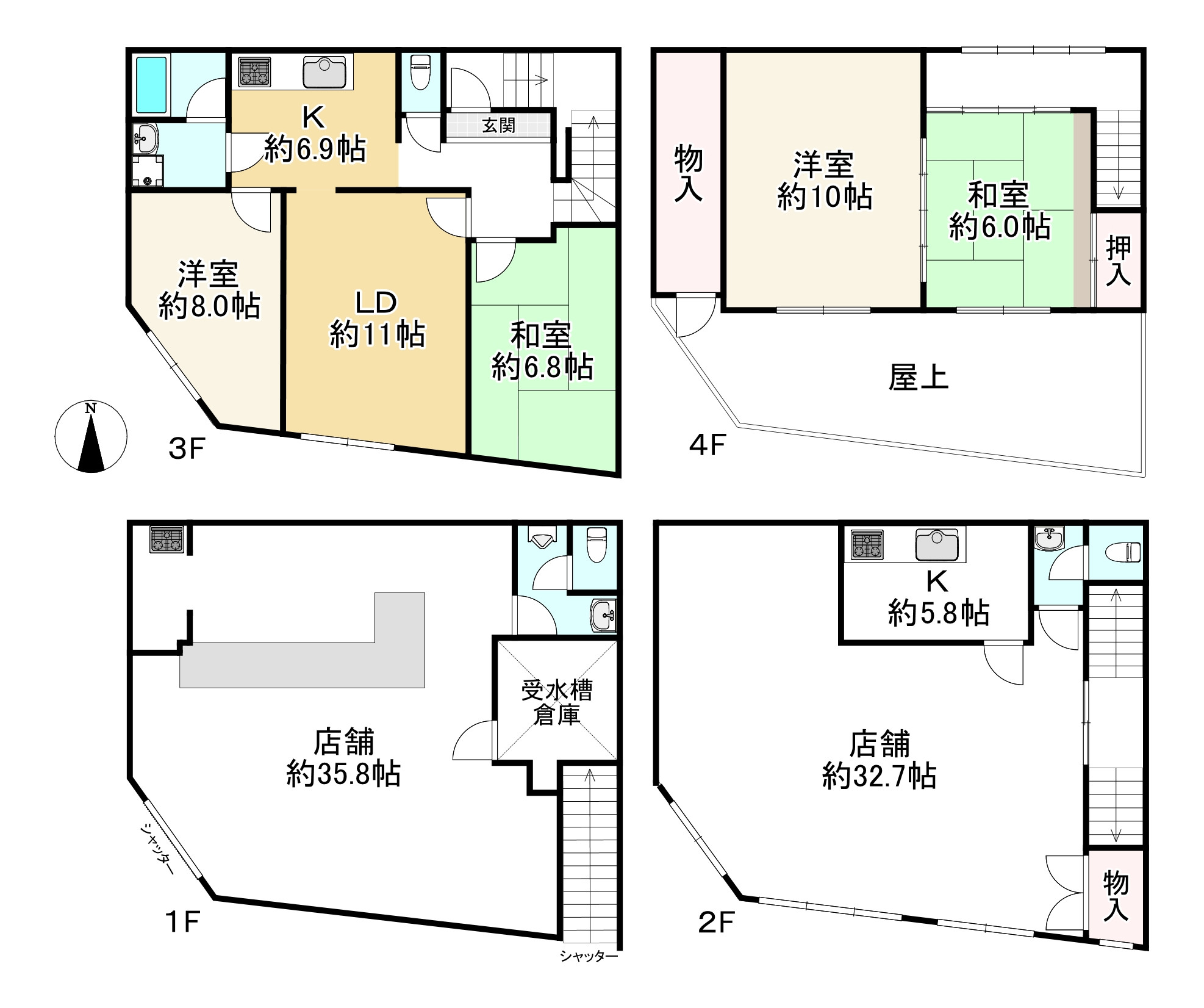 | 備考 | 月額賃料:200000円(共益費込み) 1F店舗:50000円 2F店舗:80000円 3F・4F居住スペース:70000円 |