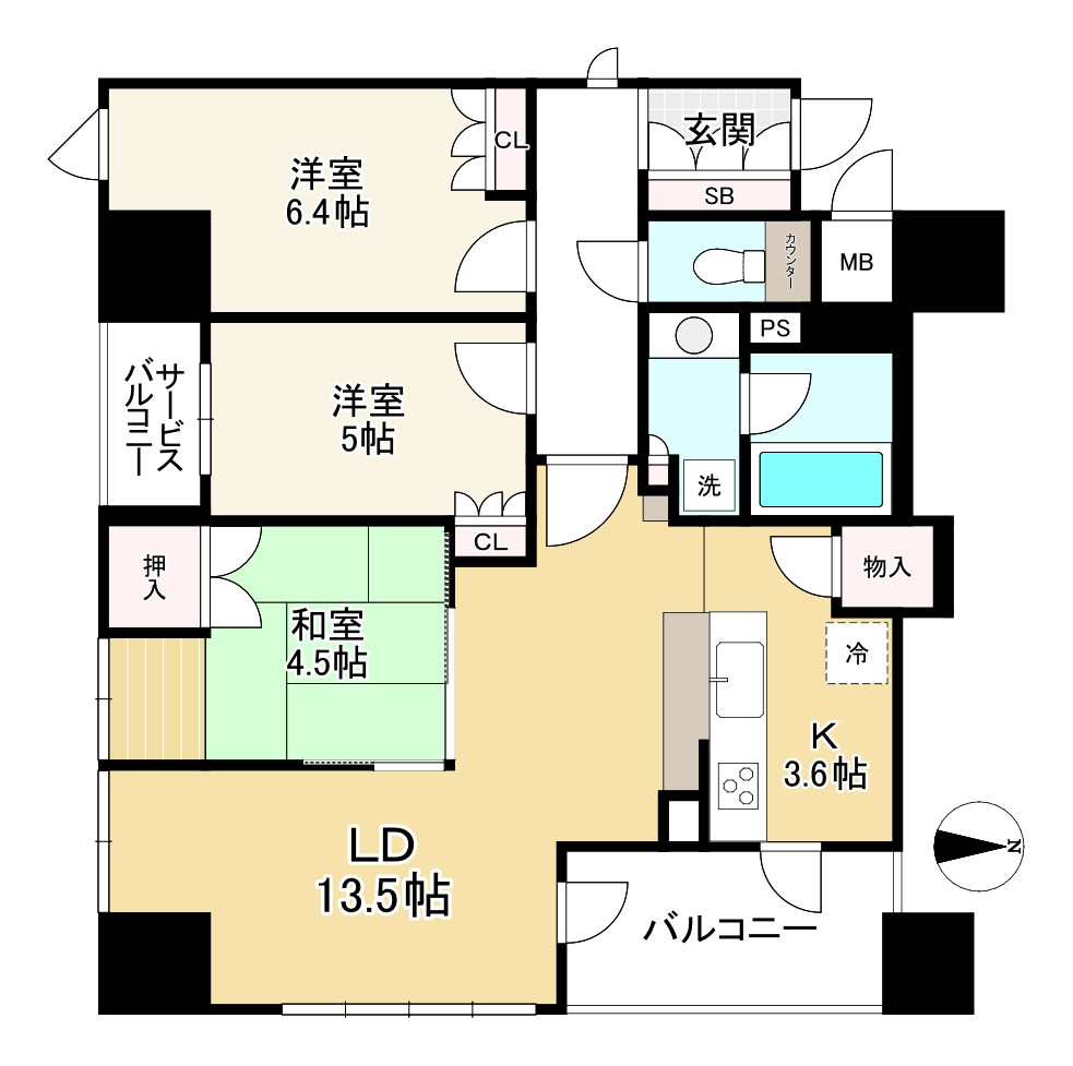フロアの端に位置する角部屋の物件です。